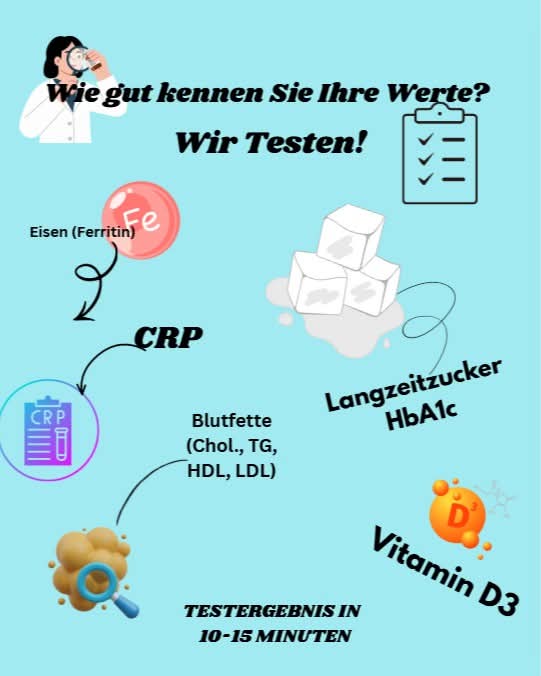Genauso unkompliziert können wir Ihr Speicher-Eisen (Ferritin), Ihren Langzeitzuckerwert HbA1c, Ihre Blutfette und den CRP-Wert messen.